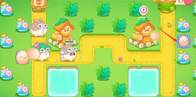 5.在如图所示位置放置一个毒针塔,毒针塔能暂时减速附近的兔子,配合大鸡蛋和魔法球可以对敌方兔子造成大量伤害