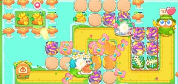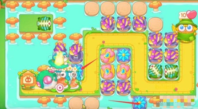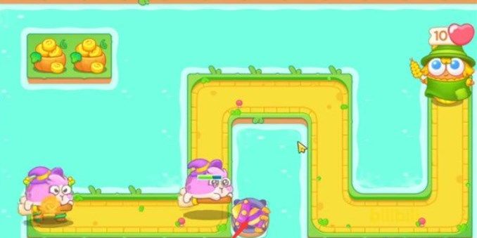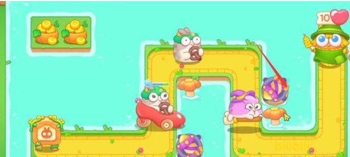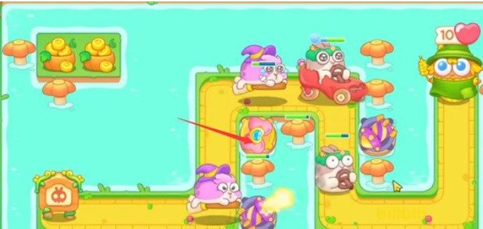 3.将箭头所示处放置一个蝴蝶结并升至满级,蝴蝶结的范围伤害可以快速清理掉下方的障碍物和附近的兔子