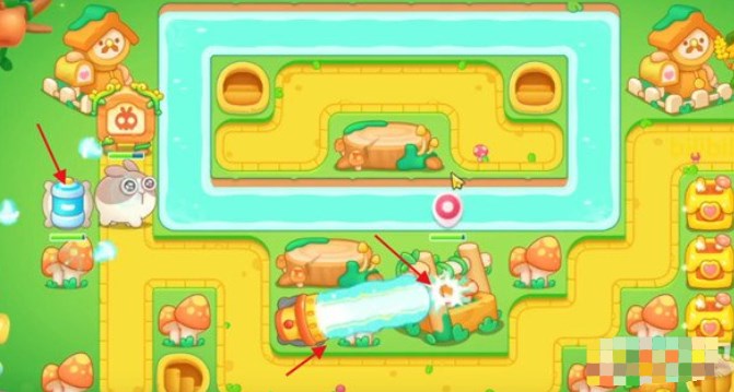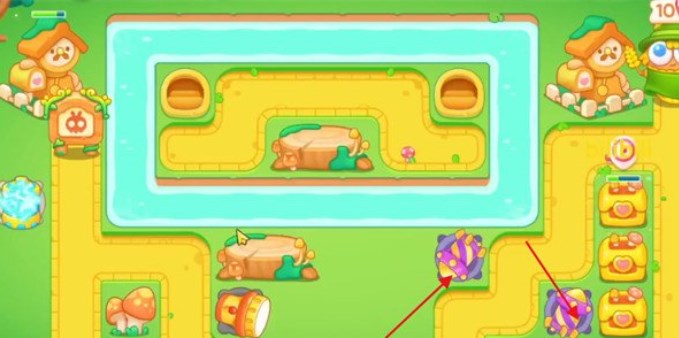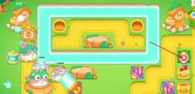 3.将箭头所示处放置一个鱼骨塔并升至满级,鱼骨塔可以快速清理掉下方的障碍物。