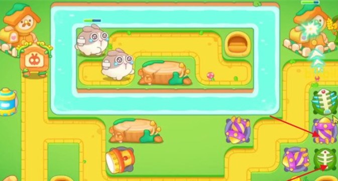 4.在如图所示位置处加上一个鱼骨塔和一个火箭塔,火箭塔可以对路径中的兔子及障碍都造成大量伤害。