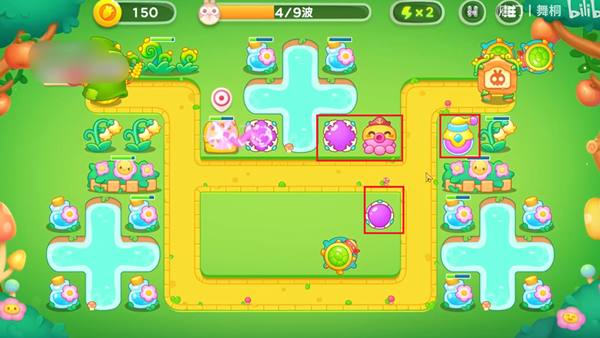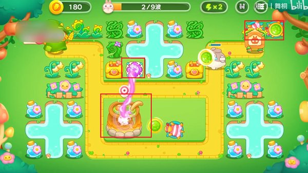 3、有钱就升级已经放置的炮台,还有钱就放更多的魔法球,在第六波的时候去左边建造两个炮塔,用来清理最后的道具。