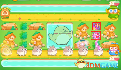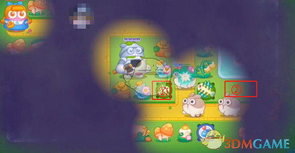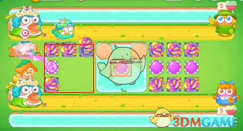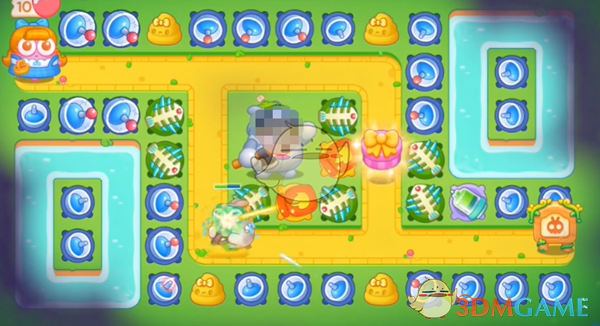 2、这里清理掉狮子右上角的道具放一个鞭炮,雷达右边的宝箱会给一个章鱼,先不用升级章鱼,优先升级狮子右侧的鞭炮,然后攻击狮子的乌云。