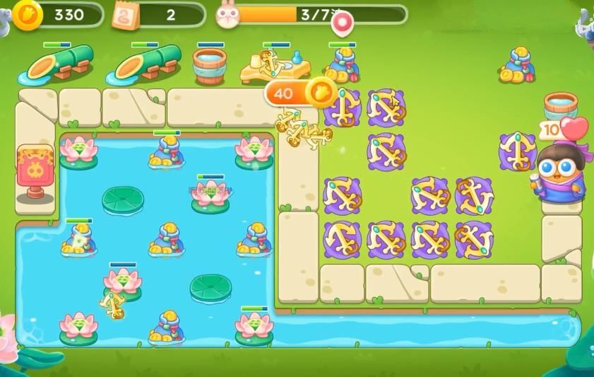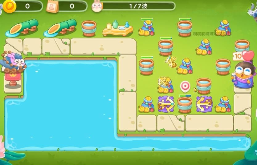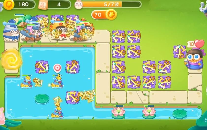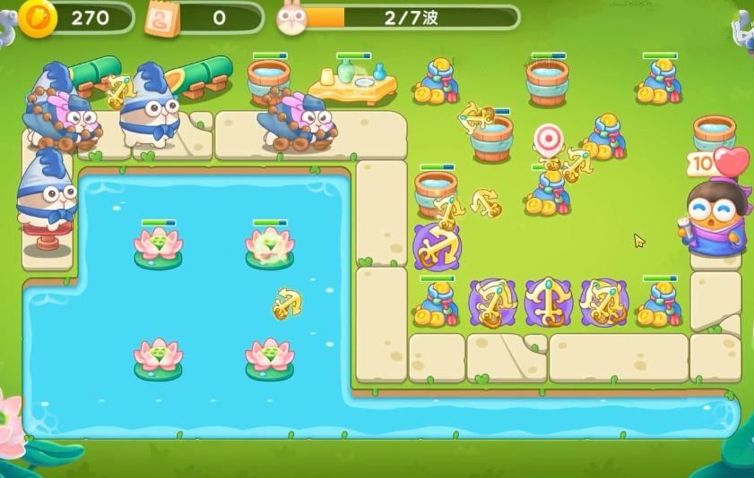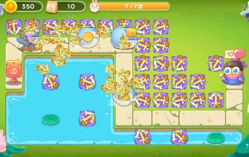5、最后将障碍清理干净后,在怪物前进的路上以及水池中出现的位置上全部放上船锚并升级,这样就可以过关了。