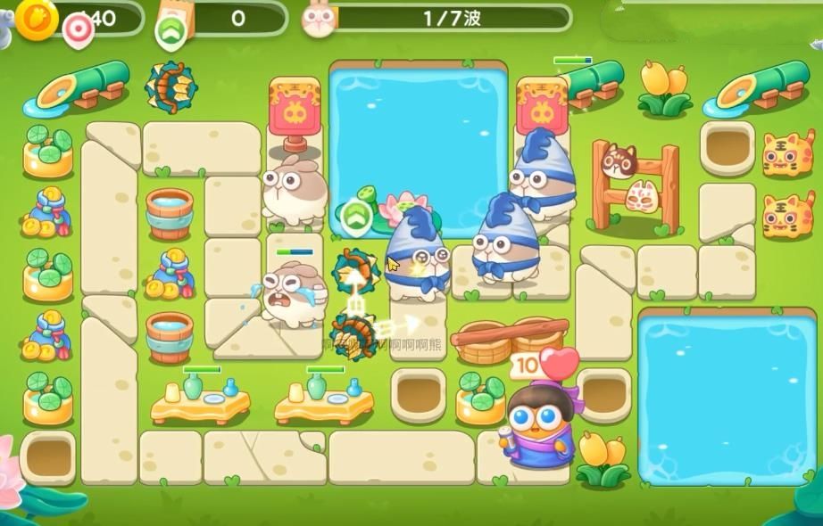 1、首先萝卜前面的空位上放上弓箭,可以在打怪的同时清理障碍。注意开局必须尽快放弓箭不然木鱼兔一多就完主不住了。这里前两只粉兔最好能锁头!