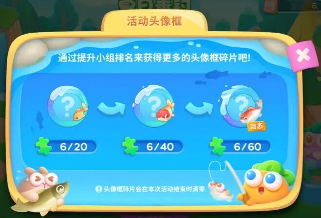每天挑战关卡后,将进入随机小组。根据当日所获得的【鱼饵】数量,将在小组内进行排名,每日结算排名发放活动头像框碎片,获得一定数量的头像框碎片可以解锁夏日垂钓活动限定头像框。
