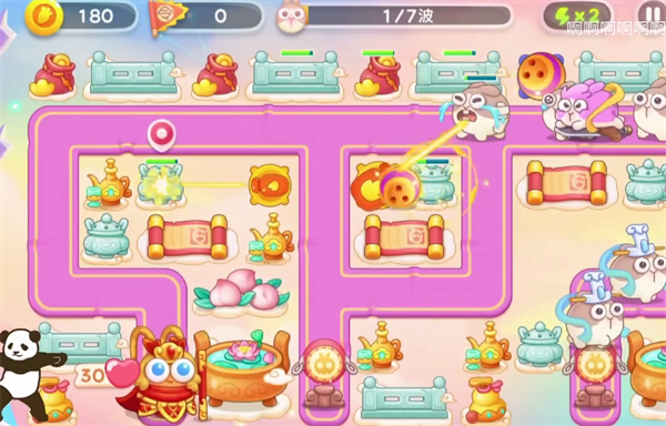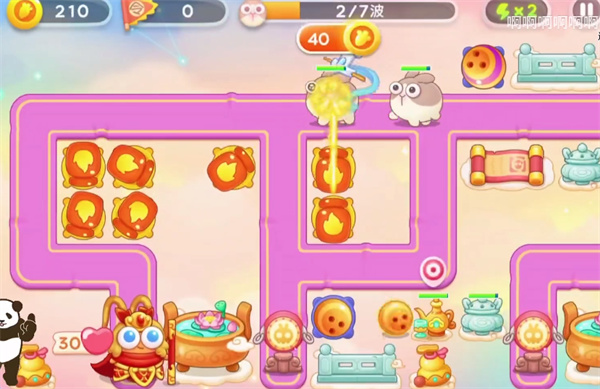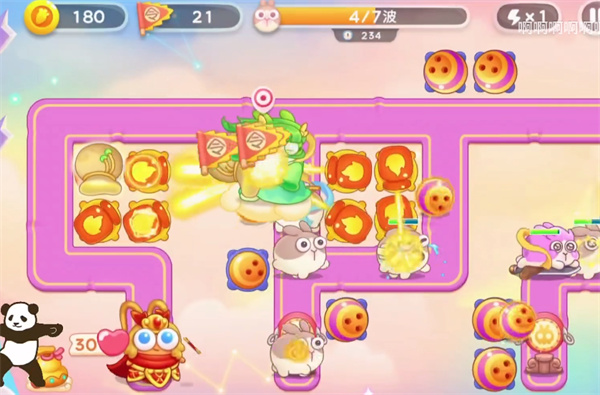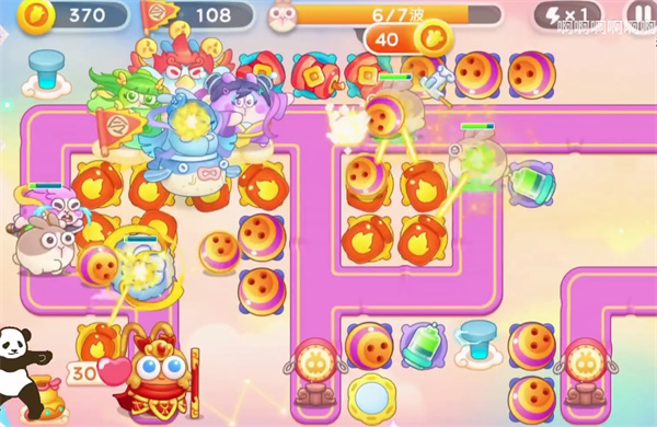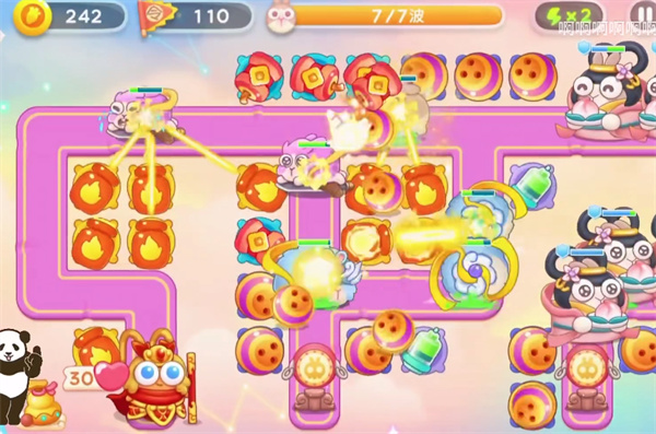 3、第四波小boss来的时候将障碍物基本全部清除,我们就可以锁定进行攻击了,再在地图上面和下面道路沿途安置保龄球进行输出。