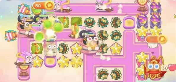 3、然后等第一波的飞飞兔全部打完之后,星星锁定右边的桃子,桃子打掉之后,再建一个星星锁定中间的钱袋。