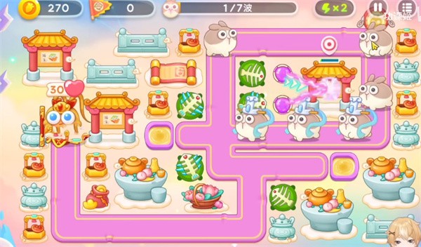 4、然后按照下图来进行摆放输出,魔法球用来清除障碍物,鱼骨头作为定点输出,金币用来升级鱼骨头。