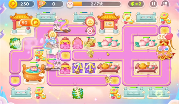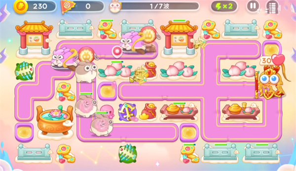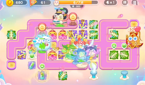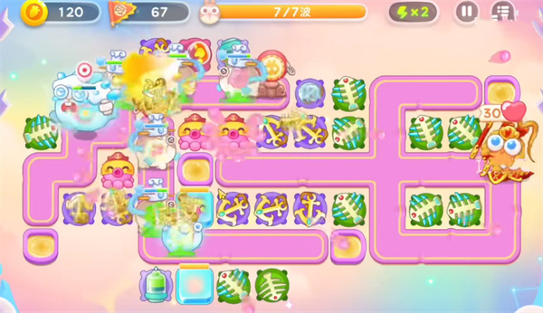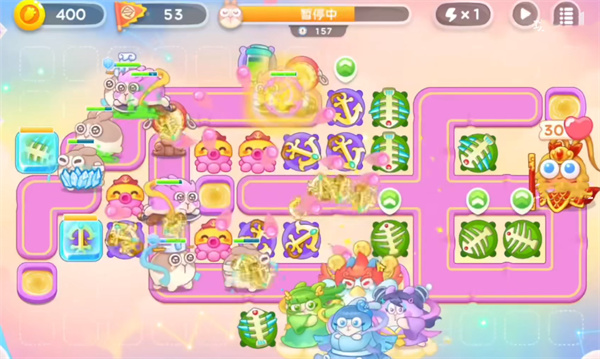 1、首先我们开局在地图左边建造鱼骨头用来清理小怪获得启动资金后,再中间位置放置船锚锁定攻击上方的桃子障碍物。