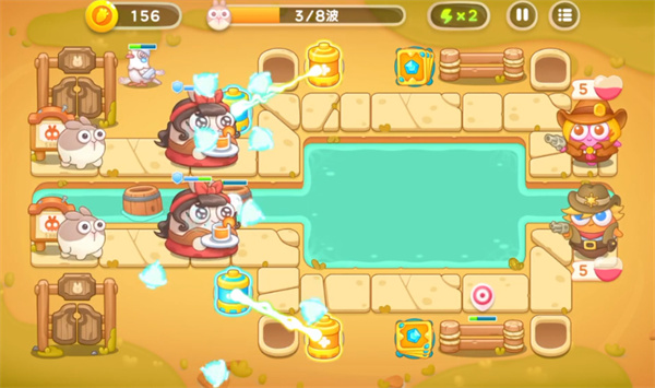 1、首先开局在左侧道路两侧放置冰桶在清场小怪的同时清除障碍物。