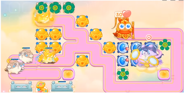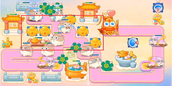2、第二波,我们需要在清图的基础上在出口处(下方红色框中)放置元宝(可以额外增加我们的金币,可以让我们后期把元宝换成雷达)第二波和第三波我们正常清理兔子打萝卜门即可有金币就在右边放雷达