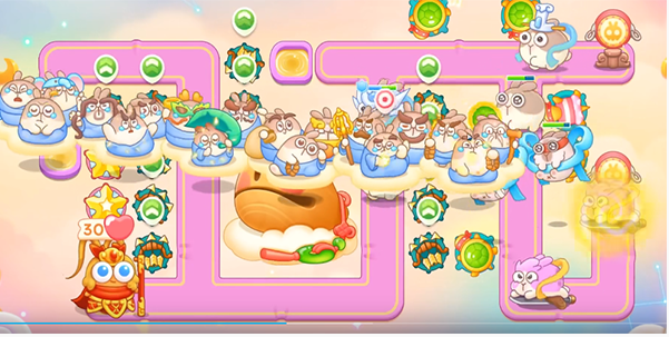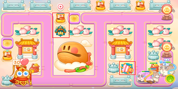 1、第一波,我们在出口处放置一个乌龟来清理兔子,中间位置我们放置多重箭先打礼盒,打完之后我们在礼盒的位置上放置多重箭打旁边的桃子,第一波我们还是需要卡兔子的血量尽量做到清图