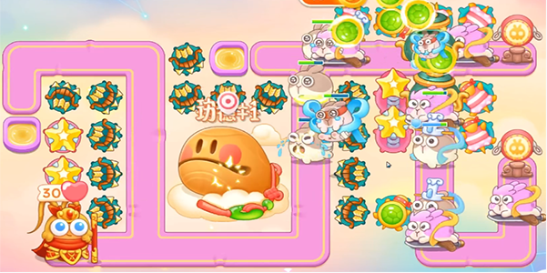 5、最后一波,具体摆放如下(首先我们是需要卡着最后一个仙女兔子,我们需要不断的买和卖防御塔,利益最大化最后我们需要在木鱼两侧放置五角星和多重箭,一方面是最后清理兔子,一方面是木鱼)