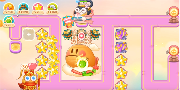 2、第二波,我们在有清图的基础上,我们左边的地图基本没有障碍物我们直接锁定木鱼打,基本方位伤害是可以进行清理兔子的,萝卜方便的五角星进行防守