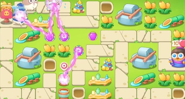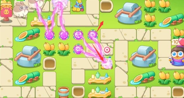 2、如下图所示,继续用魔法球打花朵、钱袋、桌子。