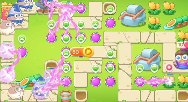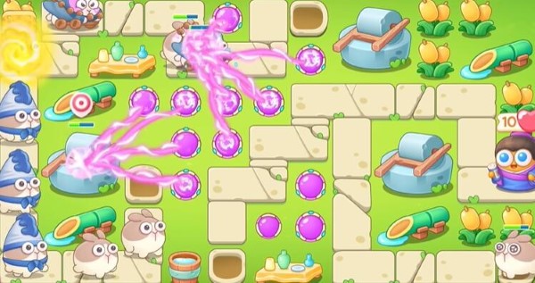 1、玩家进入游戏关卡后建造魔法球打桌子,然后打兔子,其他魔法球打水桶。