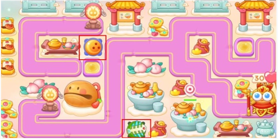 1、首先我们开局之后,就在标记好的位置上建造上鱼骨和保龄球,分别把他们都升级,用来清理掉周围的茶桌。
