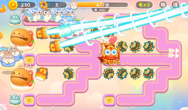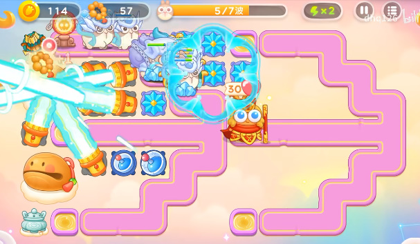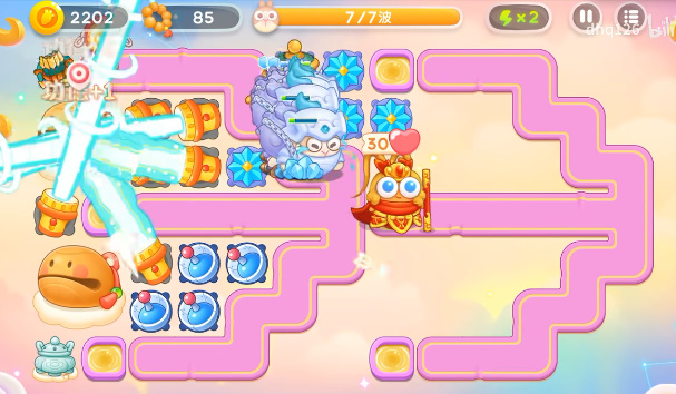 5、然后第五波就需要把右边的炮台全部拆掉,放上雪花炮台,卡一下连续冻结,就是经常说的永冻。