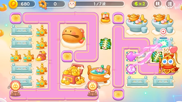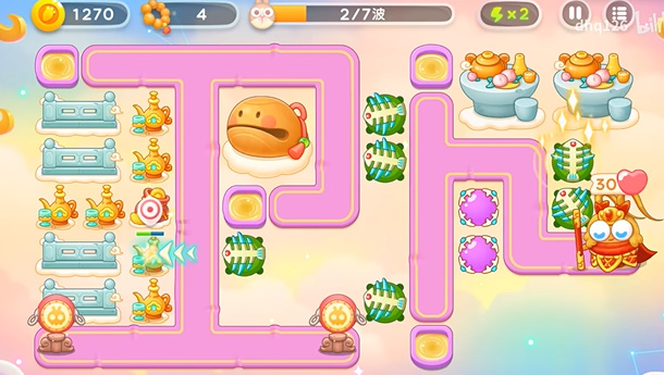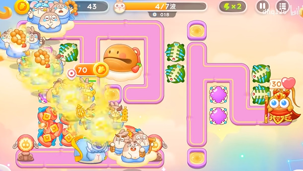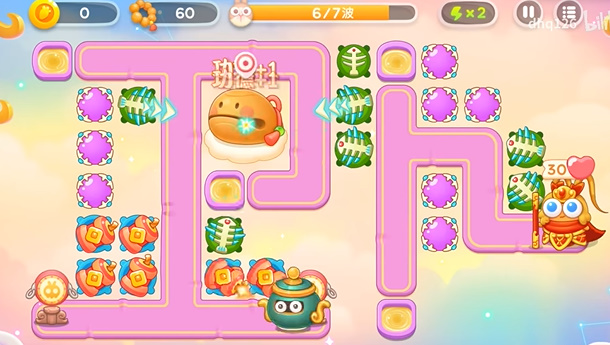 5、不断的增加木鱼周围的炮台,可以全程锁定木鱼的,因为爆竹攻击不到木鱼,所以只能攻击罗汉。