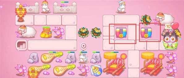 2、第二波和第三波分别一左一右放上磁铁,再放上一个多重箭,在打兔子的同时,也能消除附近的障碍物。