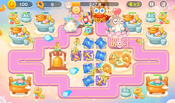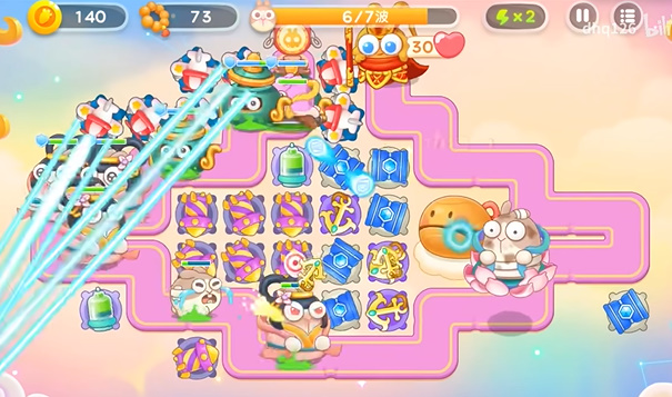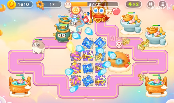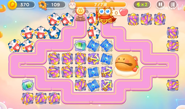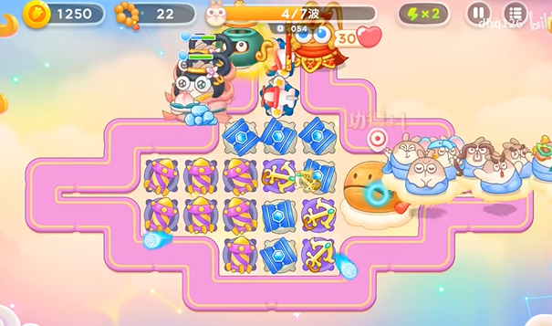 1、一开始就可以在萝卜的附近放上一个飞机,升满级,用来打小怪。然后中间的空位用双向炮来搞定。