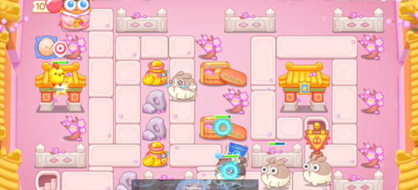 3、在地图中央和左侧萝卜周围补充鸡蛋、冰桶和爆竹,进一步提升火力。