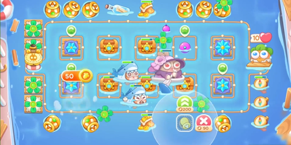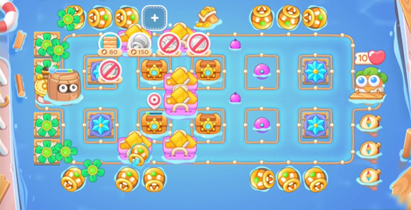 2、在空出来的格子上建造鱼雷,同时攻击中间的宝箱。