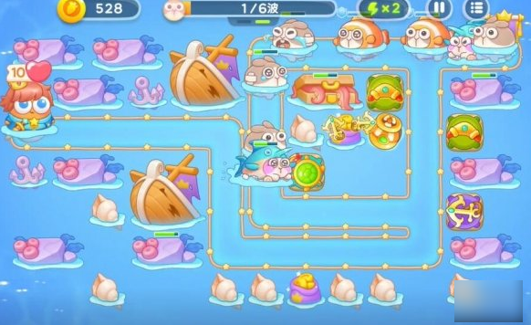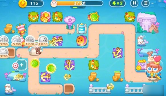 1、利用第一轮留下的回旋镖和船锚,清理掉路上的障碍物。放置鱼雷塔,对水下的敌人进行攻击。配合第一轮的塔,抵挡住第一波的进攻。