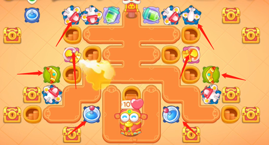 4、这一关道具不是很多,宝箱很多,全部清理完之后我们只需要补炮台增加伤害就行了,飞机、鸡蛋、风扇都很适合这关。