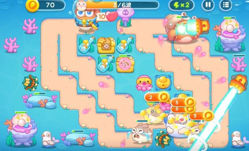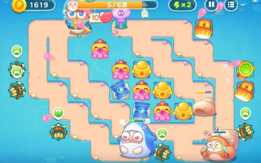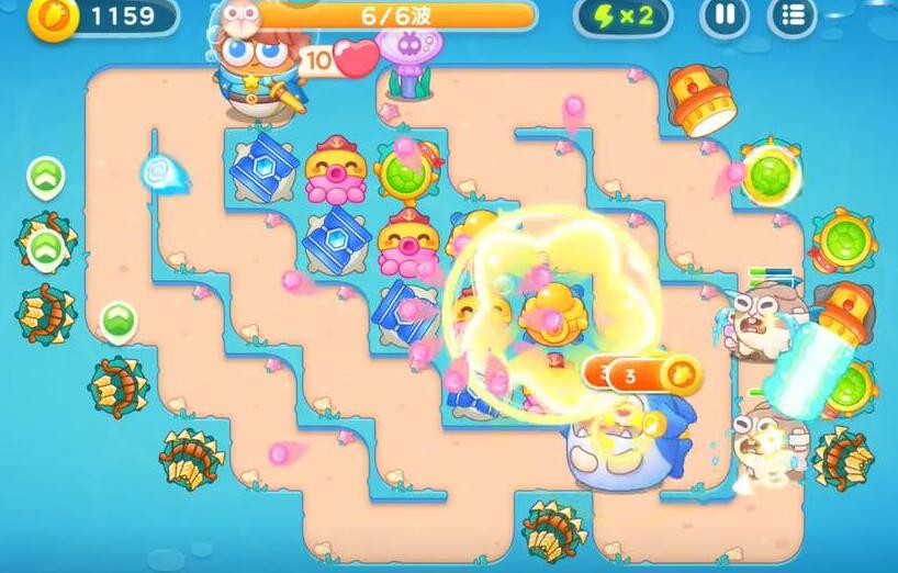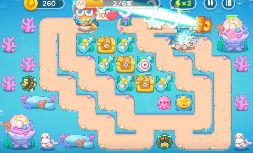 2、在最左侧的珊瑚边上建造多重箭补刀兔子,在宝箱右侧建造元宝,和多重箭一同进行输出,摧毁宝箱可以获得章鱼。