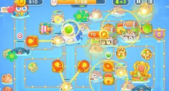 3、摧毁顶端的宝箱可以获得风扇,并且对其进行升级,用来对兔子进行补刀,在地图的右下方建造一个元宝。