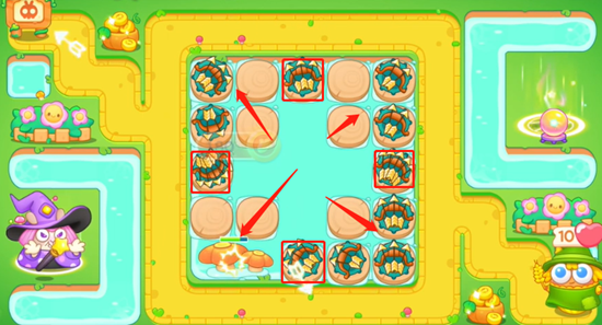 1、首先我们在中间的水池中的四个地方放置多重箭,然后一遍清理怪物一边清理水池中的其他道具,继续放置多重箭。