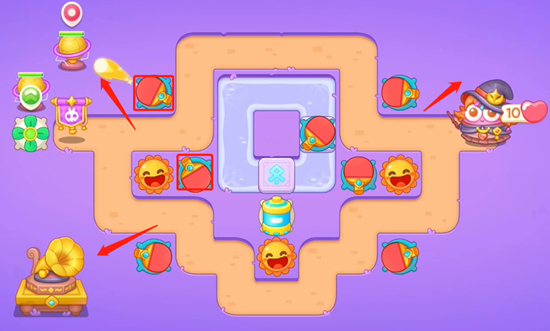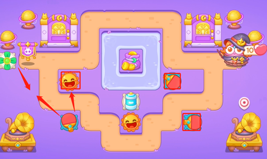 2、优先清理小中道具,清理掉继续放置,太阳花曾家山伤害,右边放置乒乓球清理道具,宝箱给的是负电极。
