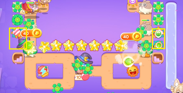 1、保卫萝卜4阿波与魔法宝藏第十七关开局我们在左右两边怪物出来的地方,建造四叶草炮塔,并且升到满级,这两个位置可以帮助我们打掉第一波,另外在中间建造海星炮塔可以以防万一。
