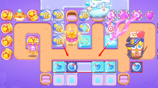 2、这一关不要急,我们使用河豚打掉中间道具,放置满级喷火器,重点也是增加魔法球数量,喷火器打掉道具继续放置喷火器。
