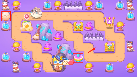 2、打掉之后我们继续放置冰锥,上宝箱给的是毒气,下面给的是聚宝盆,出口这里防御,左边我们清理道具。