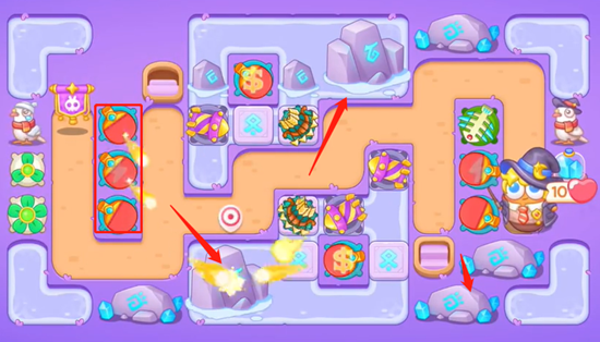 3、之后就增加线上的炮台并且清理场上所有的炮台,这一关的石头道具很多,注意导弹数量也要多。