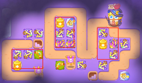 3、打掉中间位置的道具之后,我们放置船锚,然后清理掉左边的道具,继续放置船锚以及向左下开图。