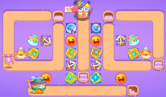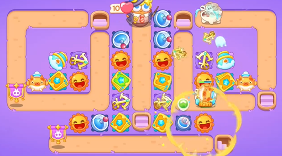 1、开局我们先在右边放置满级船锚,然后打掉中间的小道具,继续放置卡牌,左边也打掉放置卡牌。