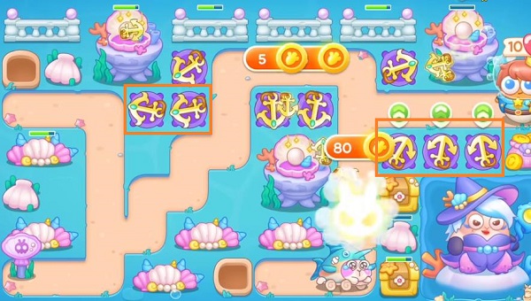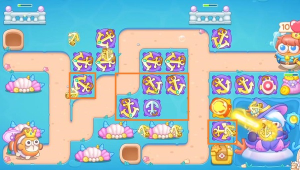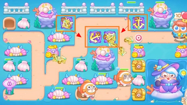 1、开局在上方位置摆放2个满级船锚,打掉中间的道具后继续摆放船锚,首领攻击是吐泡泡,第一时间暂停点掉就行。