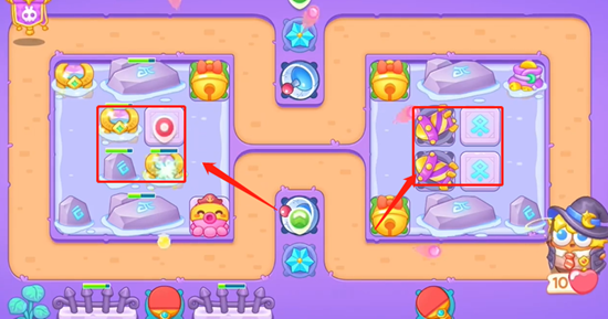 4、右边这里宝箱给的炮台可以卖掉,做好空防部署,然后把剩余的道具全部打掉拿到全清,水中还会出现很多炮台。