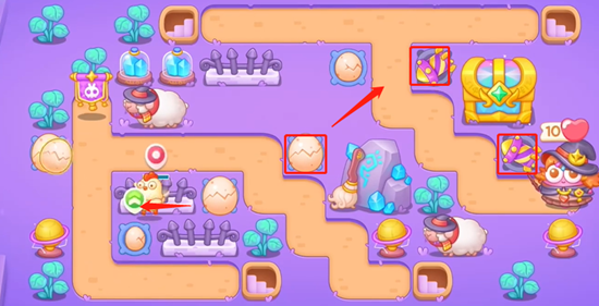 1、开局我们先在出口这里放置满级鸡蛋,然后在右边也放置鸡蛋清理周围道具,有怪过来先打怪。