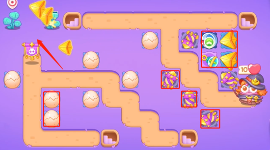 2、打掉右上角的道具,我们继续放置鸡蛋打掉宝箱周围小道具,防止导弹一起把大宝箱打出来,出口注意部署。