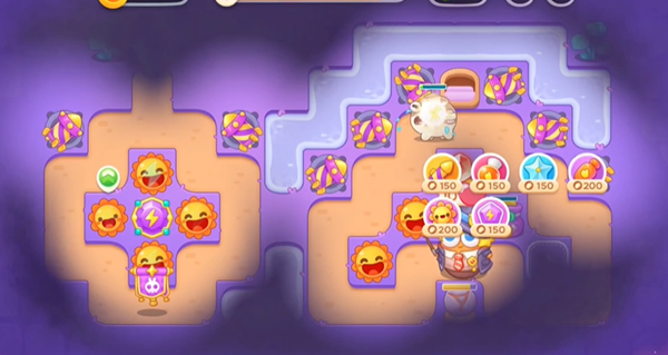 3、右下角拆完之后放置太阳花炮塔,升到满级太阳花后就把火箭锁定去打左上角的大石头。