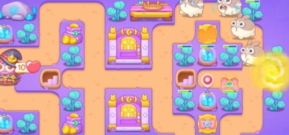 4、继续在右侧补充多个蝴蝶结和水晶炮塔,继续清理道具。