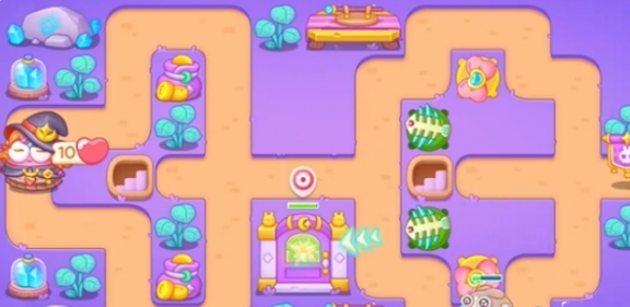 1、本关主要使用蝴蝶结、烟花和鱼骨这三种炮塔。