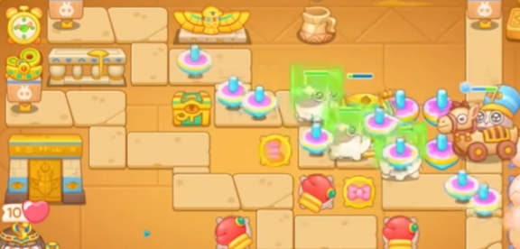 4、继续在右侧建造多个满级陀螺,清理上方的道具。