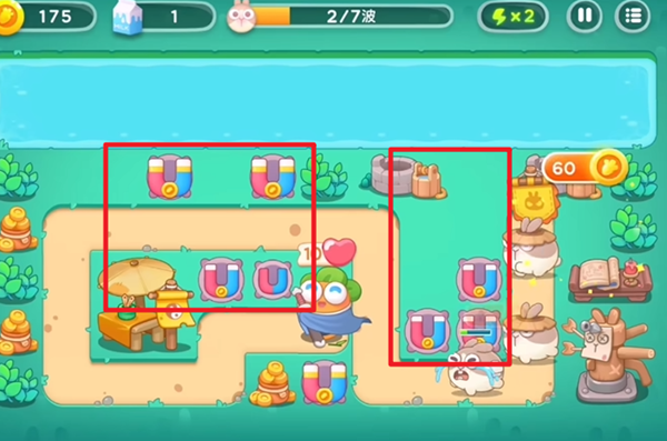 1、在怪物即将出现之前,我们先按下暂停键。此时,要在下方的位置建造一个磁铁炮塔,这个磁铁炮塔的作用可不小,它能够对右侧的障碍物进行拆除。而且,这个磁铁炮塔上面的磁铁部分还可以起到断后的作用,在应对怪物来袭时能发挥一定的防御功能。