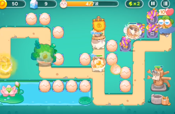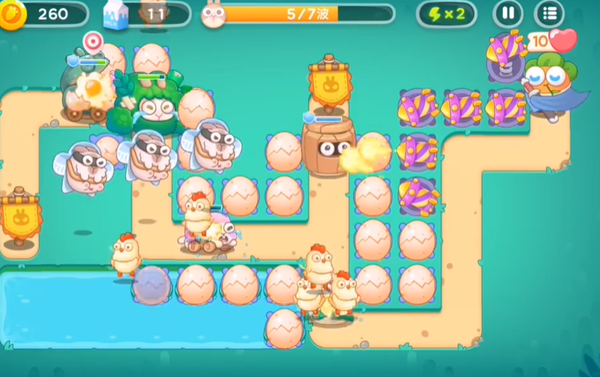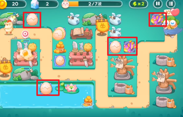 1、游戏初始的时候,一定要将蛋壳放置在左上角的位置,这是一个比较关键的布局策略。然后,在家的附近放置一个追踪导弹,这样的放置能够在游戏初期为我们构建起一定的防御体系并且有助于后续的游戏操作。