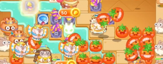 2、把右侧道具清除后,继续在右侧补充番茄炮台并将其升级